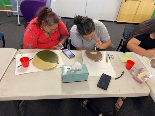 The Biripi Women’s group under the guidance of Keisha, Monique and Mel added beautiful touches to the smaller shapes throughout the river walk section of the mural.